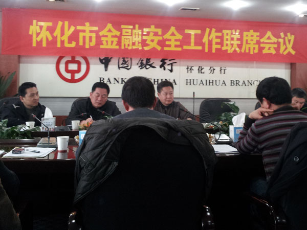 2013年1月15日下午3時,懷化市金融安全工作聯(lián)席會議在中國銀行懷化分行會議室勝利召開。會議由懷化市公安局治安支隊政委肖守元同志主持,參加會議的有懷化市公安局黨委委員丁繼元同志、懷化市銀監(jiān)局紀委書記陳勇同志、以及各專業(yè)、商業(yè)銀行主管安全保衛(wèi)工作的副行長、保衛(wèi)處、科長、武裝押守公司、懷化金劍保安公司、市保安協(xié)會領導等。