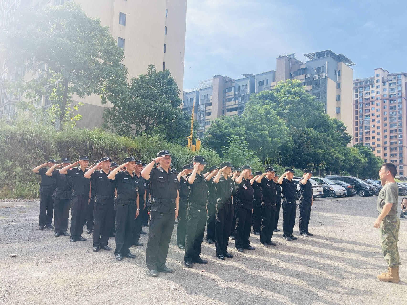 在首先進(jìn)行的場外隊(duì)列訓(xùn)練中,培訓(xùn)教官訓(xùn)練保安隊(duì)員立正、稍息、跨立、向左(右)轉(zhuǎn)、敬禮等軍事技能。