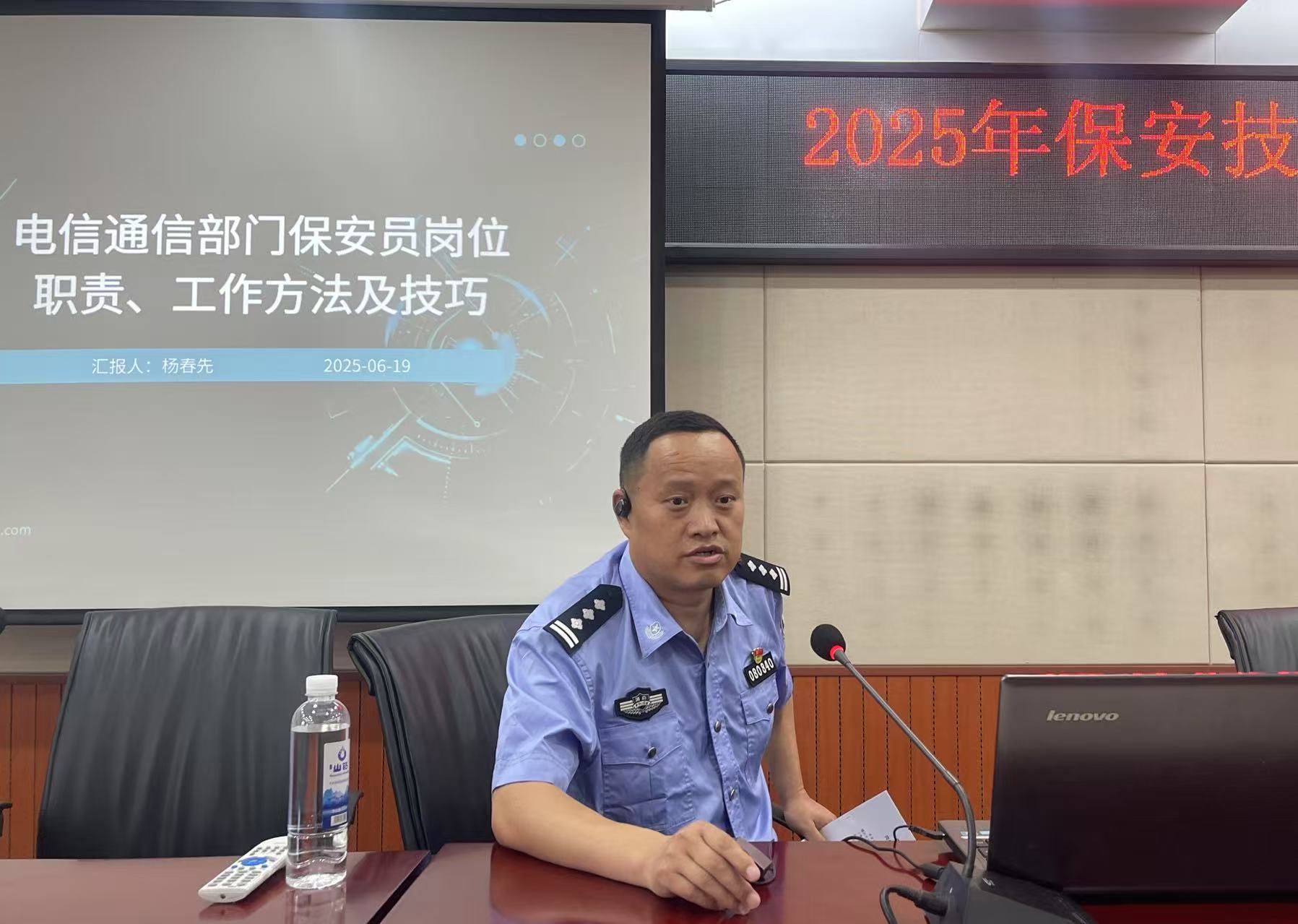 隨后,懷化市公安局鶴城分局治安大隊(duì)副大隊(duì)長(zhǎng)楊春先為保安人員帶來(lái)了一場(chǎng)精彩的專題講座。講座圍繞 “通信部門保安員崗位職責(zé)、工作方法及技巧” 展開(kāi),楊副大隊(duì)長(zhǎng)憑借豐富的實(shí)戰(zhàn)經(jīng)驗(yàn)和專業(yè)知識(shí),深入淺出地講解了通信部門安保工作的特點(diǎn)與重點(diǎn)。他從保安員的基本職責(zé)出發(fā),詳細(xì)闡述了日常巡邏、門禁管理、突發(fā)事件應(yīng)對(duì)等工作的規(guī)范流程和實(shí)用技巧,并結(jié)合實(shí)際案例,生動(dòng)地剖析了在工作中可能遇到的各種問(wèn)題及解決方法。參訓(xùn)人員認(rèn)真聆聽(tīng),仔細(xì)記錄,紛紛表示受益匪淺。