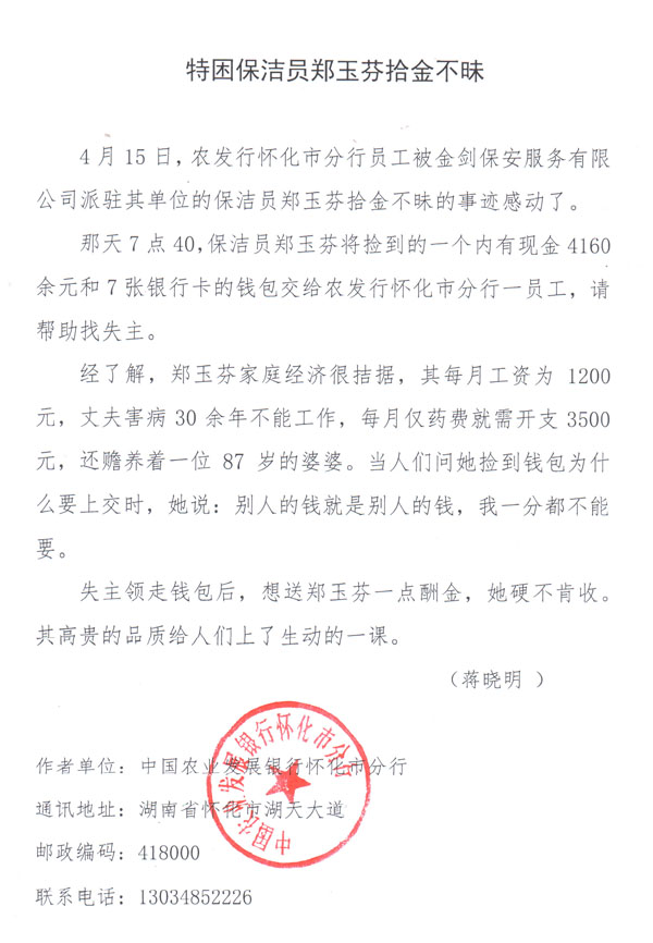 4月15日,中國(guó)農(nóng)業(yè)發(fā)展銀行懷化市分行員工被金劍保安服務(wù)有限責(zé)任公司派駐其單位的保潔員鄭玉芬拾金不昧的事跡感動(dòng)了。